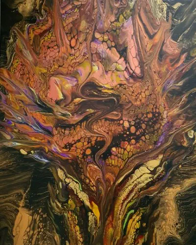 Fliesstechniken, lässt sich intuitiv von Farben, Texturen und dem Moment leiten.