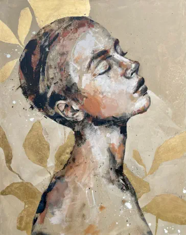 spezialisiert sich auf Mixed-Media- Porträtmalerei, in der sie Themen wie Freiheit, Selbstentfaltung