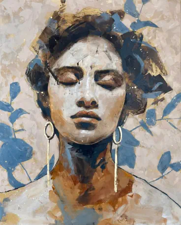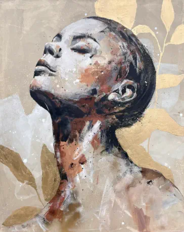 spezialisiert sich auf Mixed-Media- Porträtmalerei, in der sie Themen wie Freiheit, Selbstentfaltung