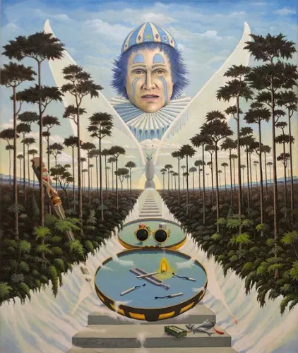 Fragestellungen, dies in surrealer Anlehnung. Er arbeitet aus der freien Vorstellung heraus in Öl,