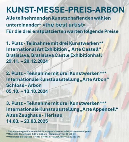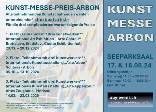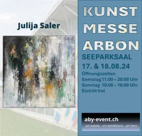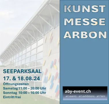 Die Kunstmesse 2024 war ein voller Erfolg! Sehr viele Besucher strömten an den beiden Tagen nach Arbon, um die faszinierende Vielfalt an Kunstwerken und kreativen Ausdrucksformen zu erleben. Die Messe erwies sich als lebendiger Treffpunkt für Kunstliebhaber, Sammler und Künstler.Die Aussteller präsentierten ihre Werke mit großer Leidenschaft, und die Besucher ließen sich von der kreativen Atmosphäre anstecken. Besonders beeindruckend war der intensive Austausch zwischen Künstlern und Besuchern. Zahlreiche Gespräche über Techniken, Inspirationen und künstlerische Visionen bereicherten das Event und schufen eine inspirierende Plattform für neue Ideen und Kooperationen. Auch die Künstler selbst nutzten die Messe intensiv, um sich untereinander zu vernetzen und voneinander zu lernen. Die positive Resonanz der Besucher und die zufriedenen Künstler bestätigen den Erfolg der Kunstmesse 2024. Wir bedanken uns bei allen Teilnehmern und freuen uns bereits auf die nächste Ausgabe, die sicherlich wieder zu einem Highlight im Kunstkalender werden wird. Die neuen Termine für die Kunstmesse stehen schon fest:13. & 14.12.24 -- 25. & 26.04.25 -- 12. & 13.12.25